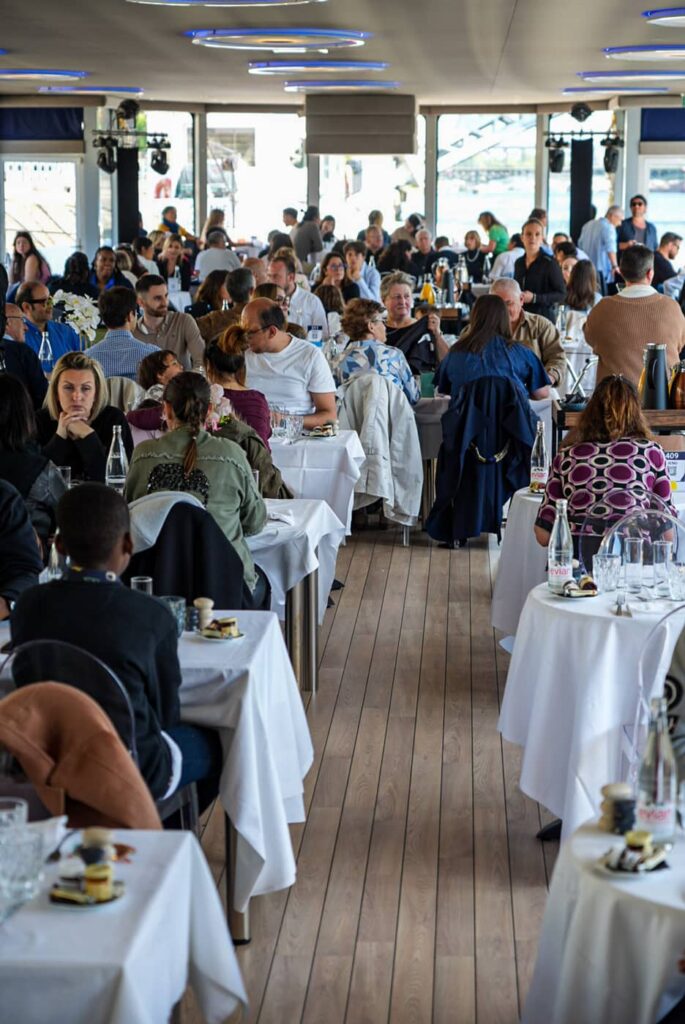 La terrasse panoramique du bateau offre une vue imprenable sur les plus beaux monuments parisiens, faisant de ce lieu l’un des plus beaux cadres pour un brunch à Paris.